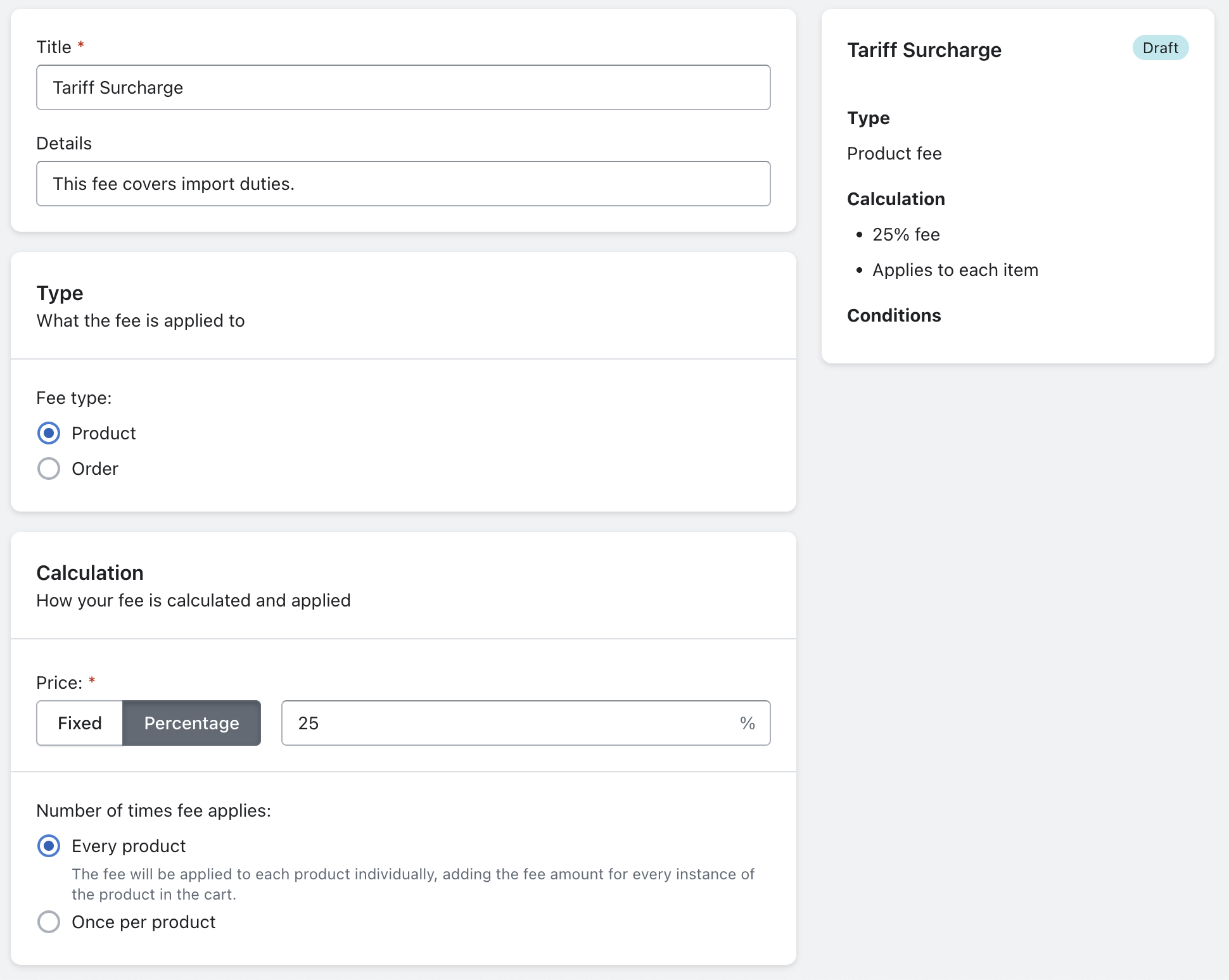 Select your fee type (product-based or order-based). For tariffs, we recommend applying it per product.