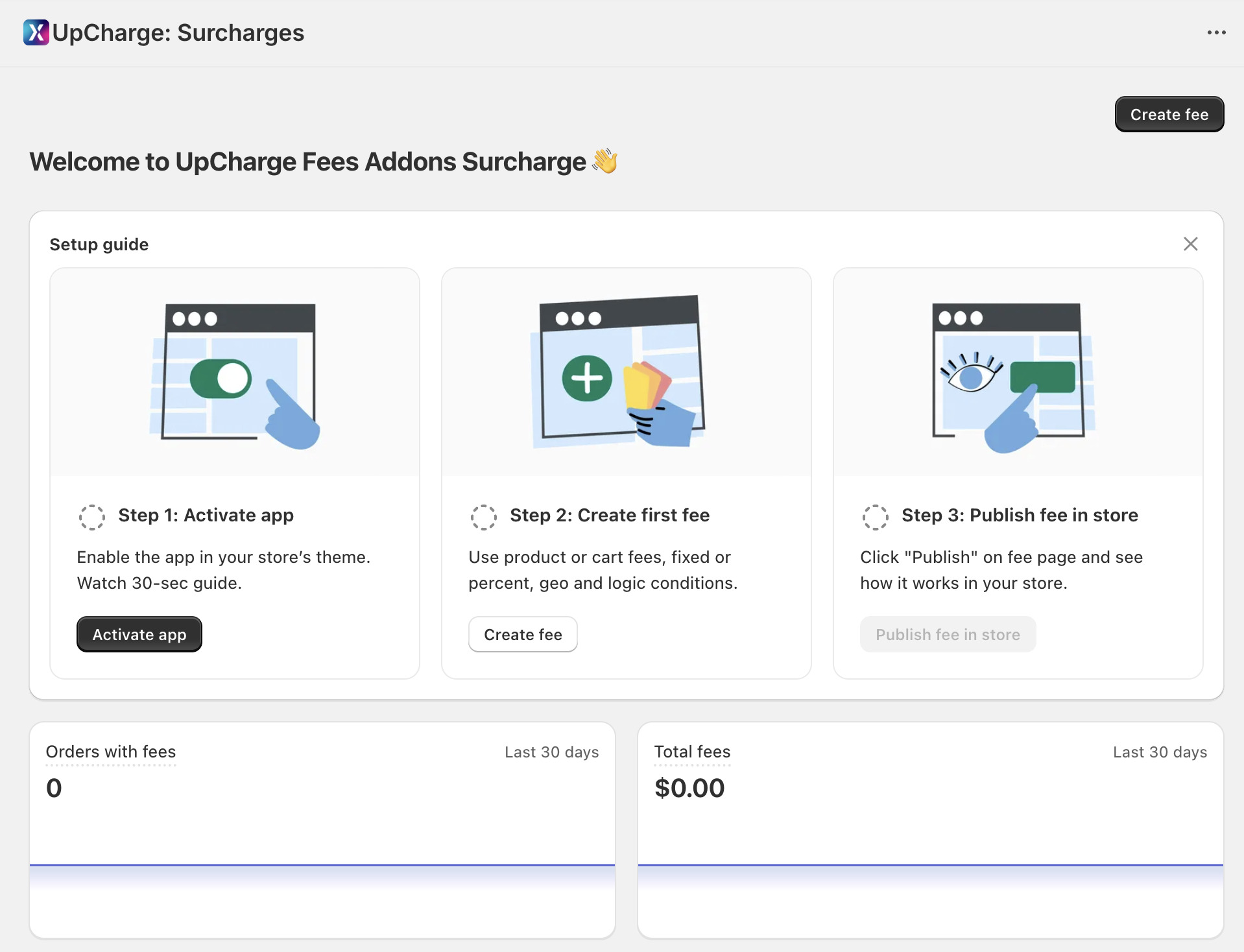 - Activate the app. This turns on the app embed in your theme so your fees can appear on product pages and in the cart.2. Create your first fee. You can choose between product fees or cart fees and set fixed or percentage-based charges.3. Publish the fee in your store. Once the fee is created, you click Publish so the fee is live on your store.