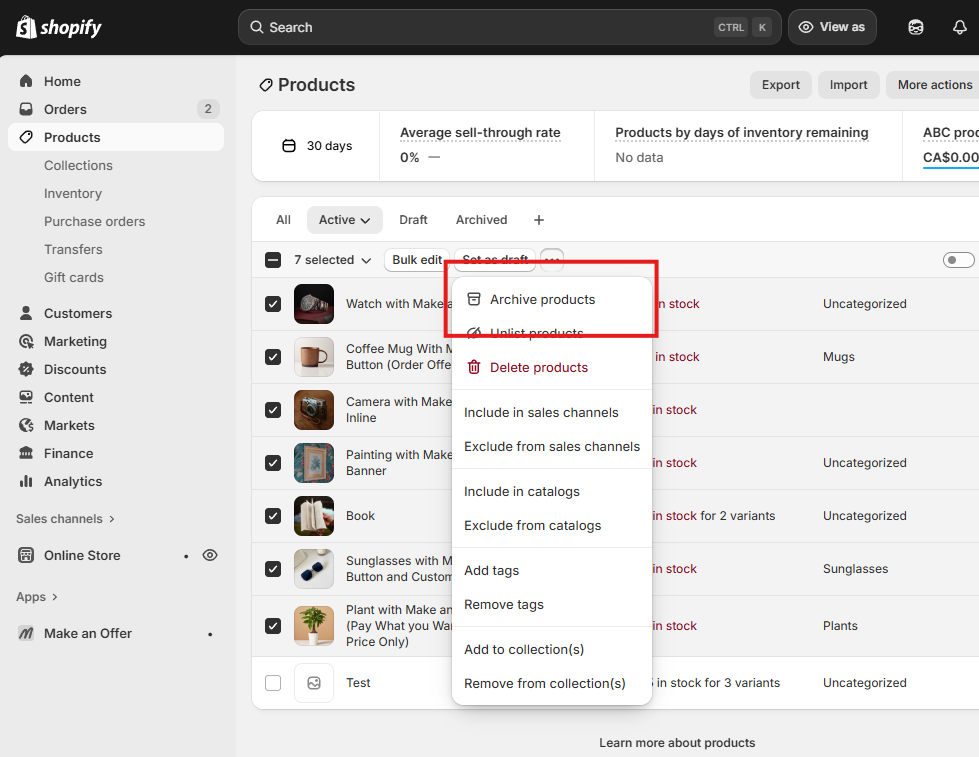 If you’re on Shopify Plus, you can create a workflow that automatically archives the product the moment inventory hits zero. It can take the product off your online store instantly, without you having to touch anything. It’s great, but Shopify Plus is $2,300/month, which isn’t realistic for most merchants selling used or unique intake items. If you’re not on Plus, then the realistic approach is to mark sold items clearly and archive them in batches. To do this, go to Products, filter by Active, and sort the Inventory column so anything with 0 stock appears at the top. Select the sold-out products, click More actions, and choose Archive products.
