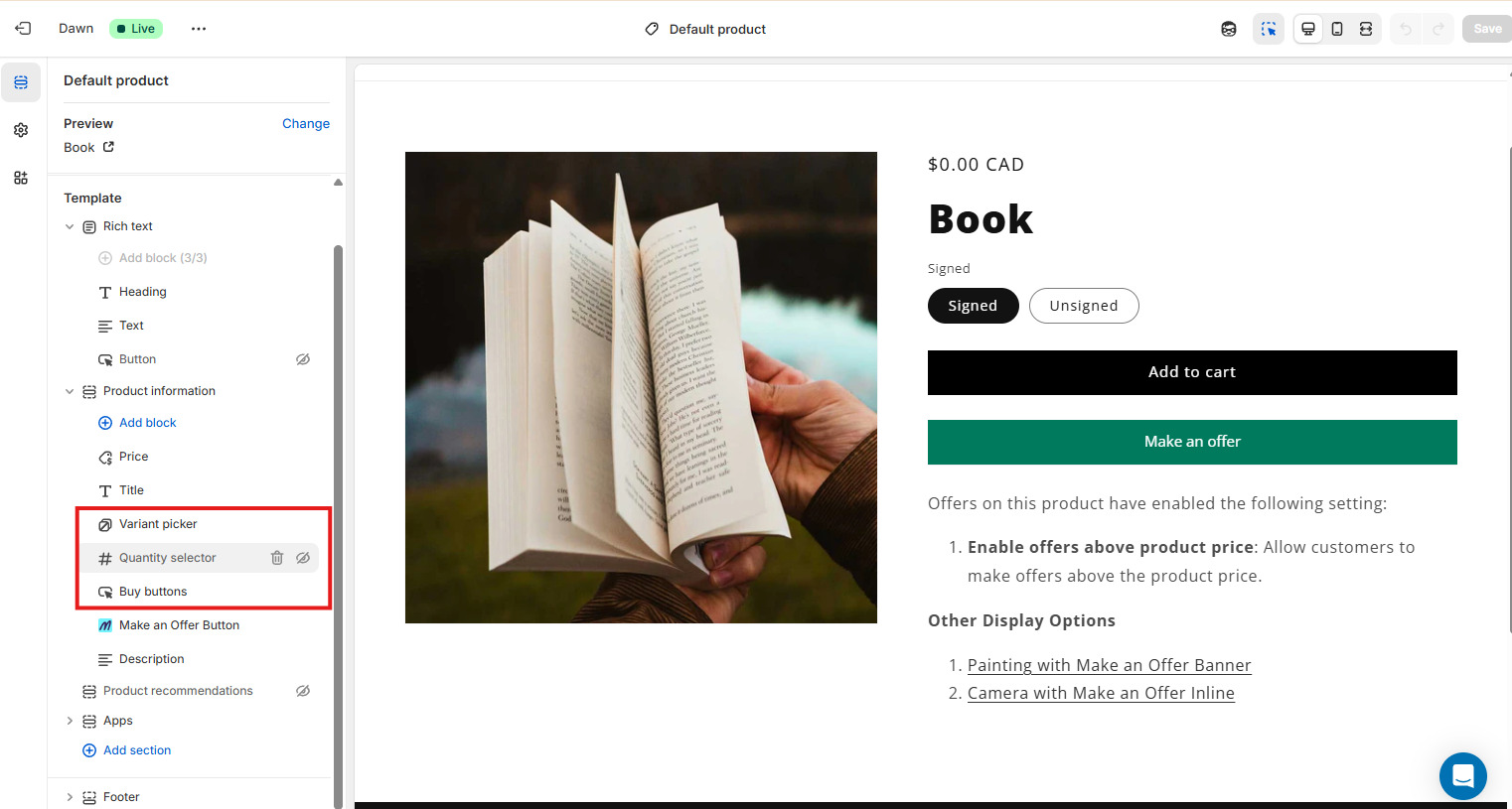 Negotiation matters a lot more with used and one-of-a-kind pieces. Some customers expect to make an offer, while others simply want a way to ask if the price is firm. Shopify doesn’t make this easy. There’s no built-in offer or quote feature.