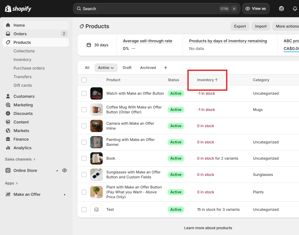 Select the “Active” filter and then sort products by Inventory (ascending).